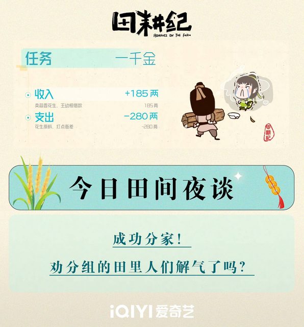 10月14日起,VIP會員每周六至周三19:00各更兩集鎖定 (首日VIP集,免費兩集)愛奇藝 田耕紀,有田有閒,撒歡搞錢! 《田耕紀》是由愛奇藝出品,中文奇蹟聯合出品 洪泠執導,金媛媛擔任編劇 大綱 本劇改編自作者弱顏的小說《重生小地主》,以宋代田園農耕生活為背景 ,講述了沈諾 與連蔓兒攜手智鬥親戚,種田經營,發家致富,並在過程中相知相愛的故事 。 家宅很寧版預告 https://video.weibo.com/show?fid=1034:4955954379423804 人物關係圖 https://i.imgur.com/yPNtgxX.jpg