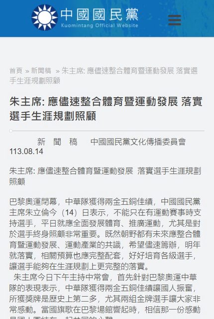 標題[新聞] 朱主席: 應儘速整合體育暨運動發展 落實