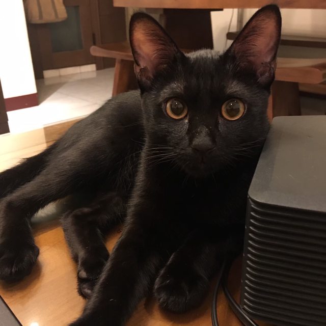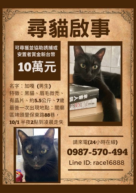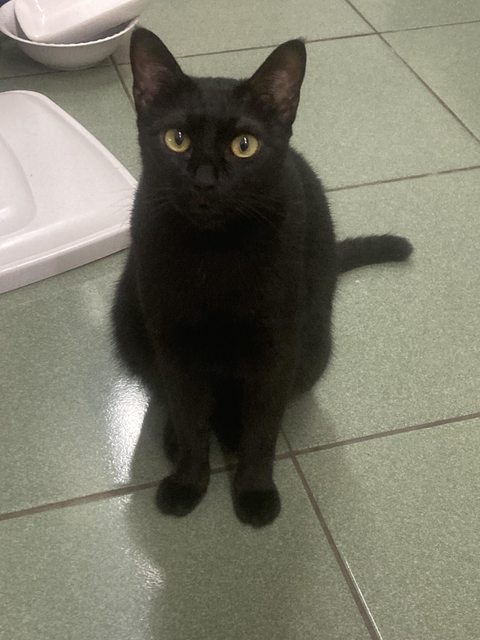 貓咪花色及特徵:黑貓、眉毛微禿、有晶片、約5.5公斤、7歲