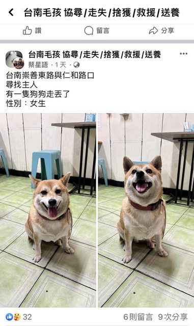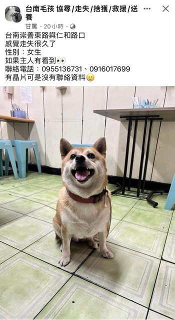 資訊是從FB社團幫忙分享的,台南東區崇善路和仁和路交叉口附近走失的柴犬,目前有好心人幫忙安置,原PO說有晶片,但是沒有聯絡電話,所以幫忙貼上來,看看能不能找到主人。