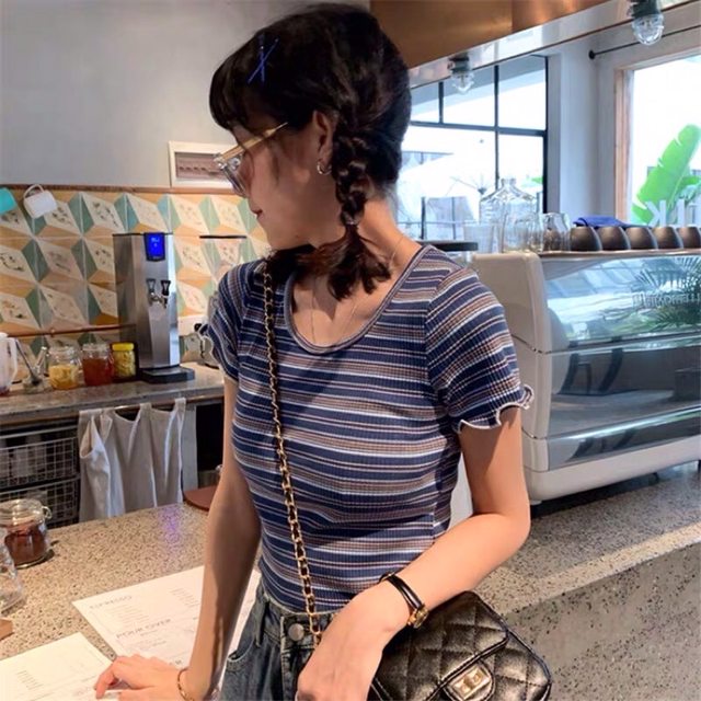16.二手 木耳邊條紋短版T $100