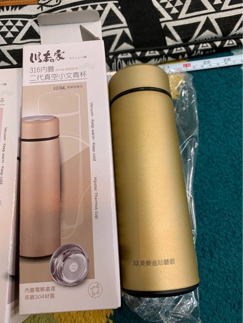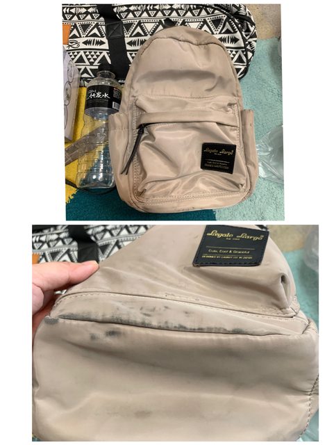 2.卡其色亮面尼龍後背包,旁邊寶特瓶是比例尺,背包底有髒污