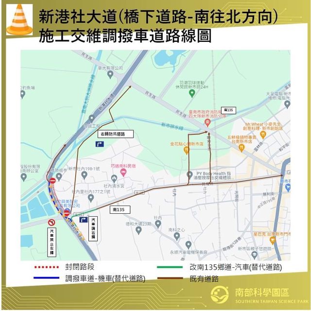 **行駛於南135鄉道往南科方向之汽車,施工期間禁止左轉新港社大道,請提早或下一路