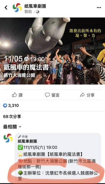 → KarlMarx: KMT市議員找紙風車來表演也是插自己的旗阿。 12/22 12:47