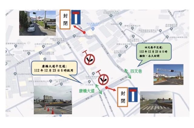 平交道永久封閉,在東西向進入四叉巷平交道道路,於東橋一路與康橋大道口、中正二街