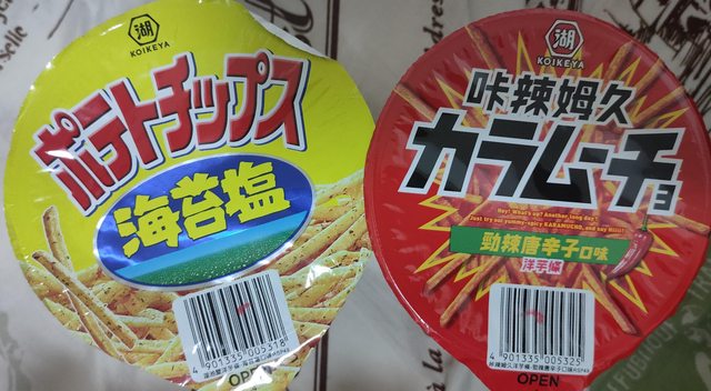 4. 湖池屋洋芋條(海苔鹽有10盒,卡辣姆久有3盒),一盒30元,有效期限2024/5/7