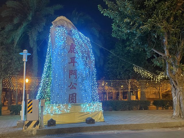 台南安南區公所將鹿耳門公園逾6米的巨型石碑,佈置燈飾