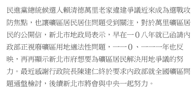 → raul12: 有什麼關係?新北市要依法徵收賴老家?硬要扯 12/27 08:05