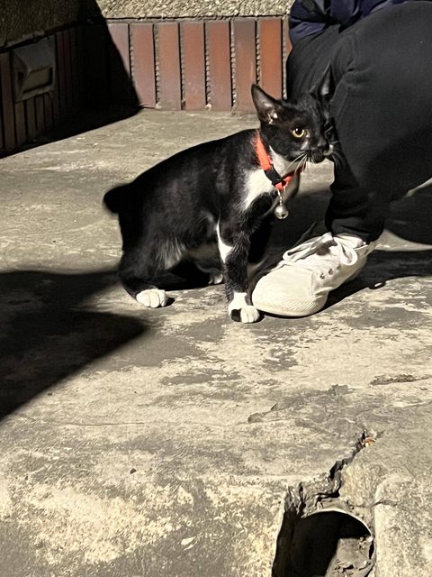 目前晚上8點20左右,在郡安路四段附近的萊爾富旁有一隻身上有掛鈴鐺的賓士小貓(麒麟尾)