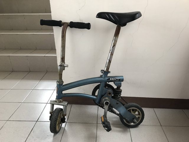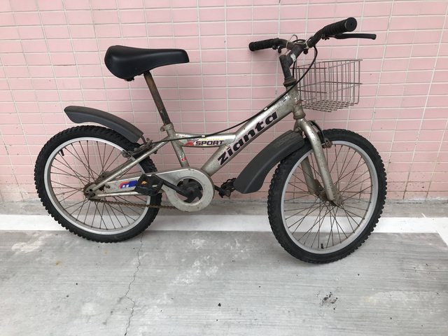 20吋腳踏車,來源為親友贈送,車身略有鐵鏽。側柱有改過,長度略有不足,可停側柱,但車身會很斜。我可先幫忙把輪胎打氣。