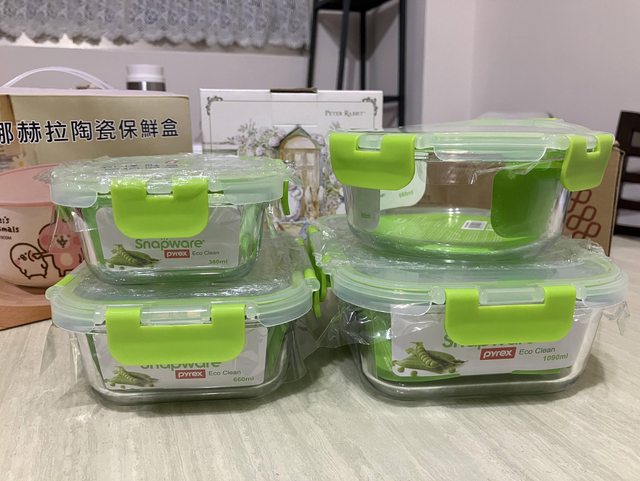 2.康寧保鮮盒4件組(380ml方形+660ml圓形+660ml方形+1090ml方形),售NT800