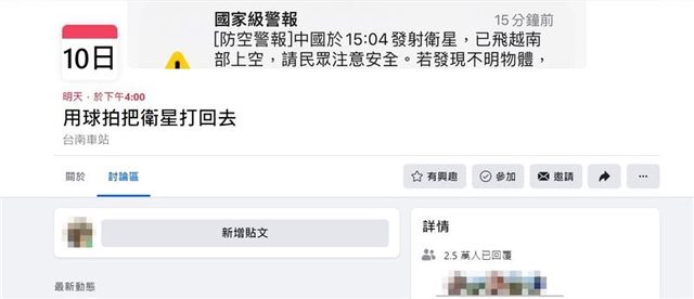 國防部今下午發布國家級警報,示警有衛星飛越南部,引發熱議。有網友還在Facebook建