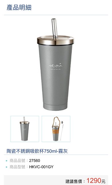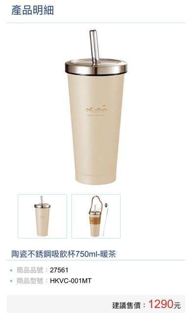 2.妙管家陶瓷不鏽鋼吸飲杯750ml(有2色可選),售500元