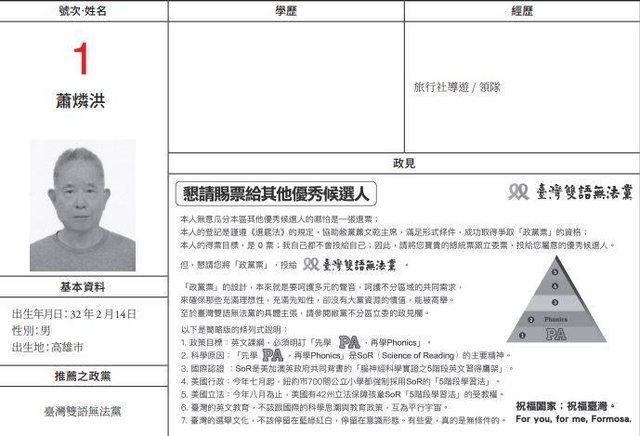 該選區還有一位阿公級候選人、「台灣雙語無法黨」的蕭燐洪,原本政見欄就寫「目標0