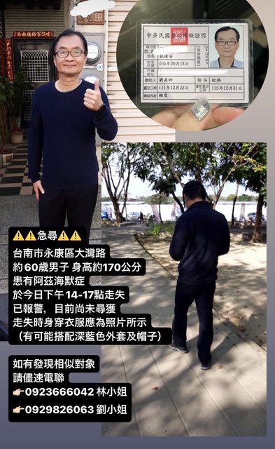→ hat13201: 都要幫容易走失的家人身上配戴聯絡資訊,至少發現的人可 01/16 10:29