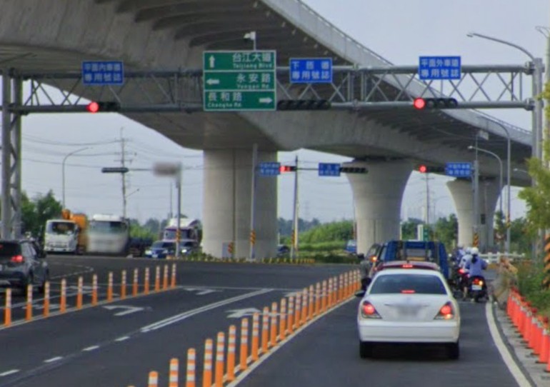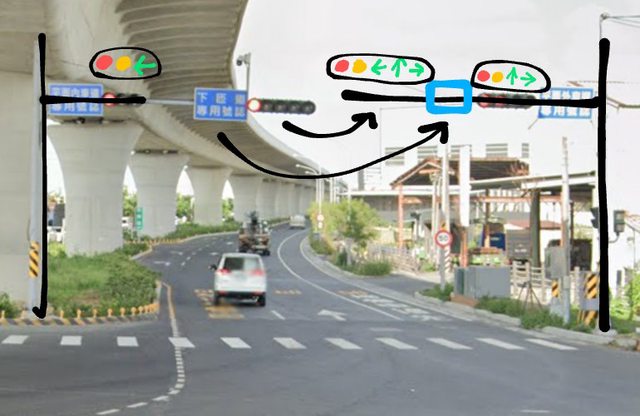 用 google maps 看是 2022 年影像, 下橋的紅綠燈在路口處設在中間