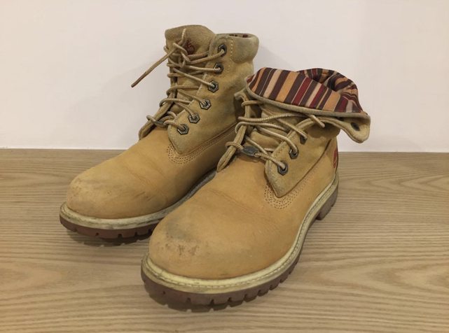 狀況:八成新,前端皮革有使用痕跡,鞋面略帶髒污。為特殊款黃靴,有一般和反折兩種