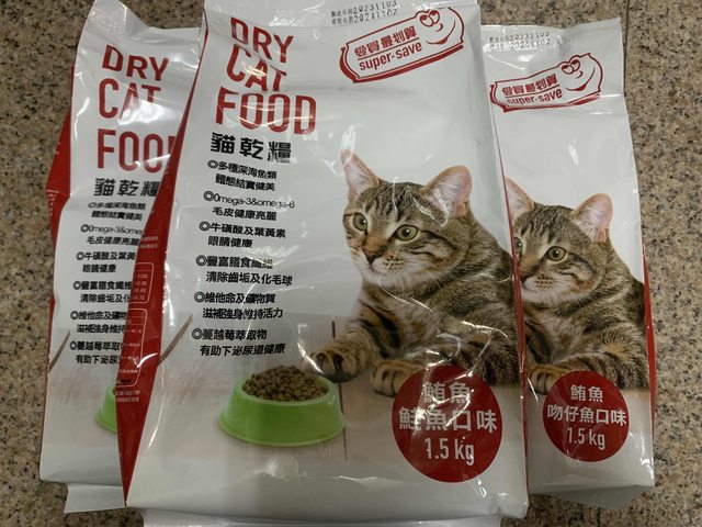 愛買貓乾糧1.5kg三包=4.5kg,售250元