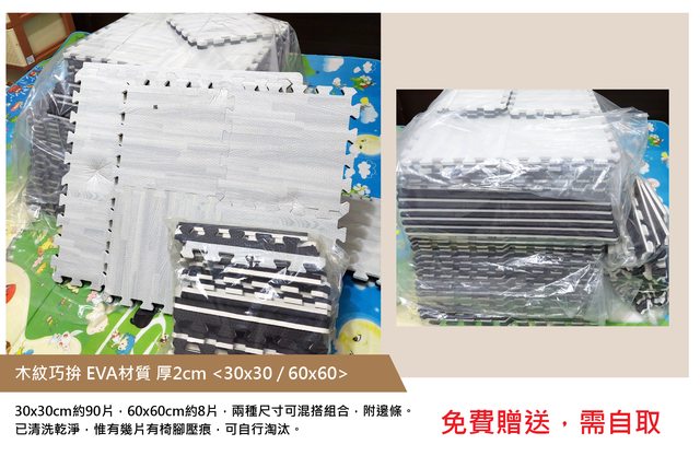 30x30cm約90片,60x60cm約8片,兩種尺寸可混搭組合,附邊條。