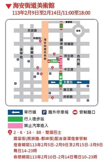 3、海安街道美術館:(1)國華街(中正路至尊王路)為行人徒步區,管制時間2月9日至