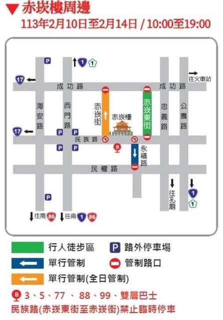 1、赤崁文化園區,(1)單行道:管制時間2月10日至2月14日每日10時至19時,赤崁街(