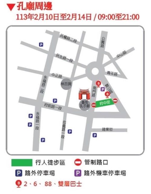 2、孔廟周邊:府中街(南門路至開山路)為行人徒步區,管制時間從2月10日至14日,每