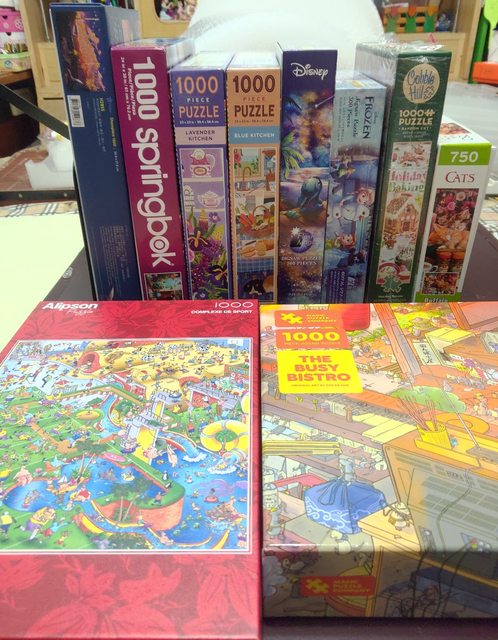 出售已挑戰完成的拼圖10盒,挪空間給下一批。只拼過一次,八盒拆大片保存,兩盒打散