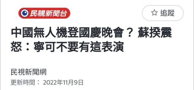 → akiranon: 中國無人機秀? 蘇貞昌震怒:寧可不要有這表演02/15 12:47