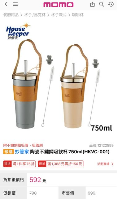 標題[交易] 售 HouseKeeper陶瓷不鏽鋼杯(750ml)