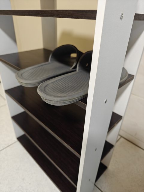 說明:久置鞋櫃這兩天才拿出來組裝,組裝後覺得太小了,圖片有26號室內拖放下去後腳