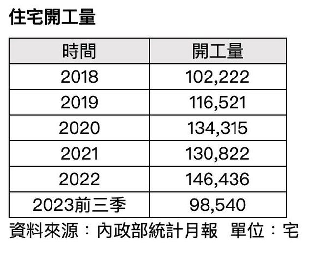 ,高峰期在2020年~2022年,一年高達13~14萬戶的開工數量,今年前三季累計也達9.9萬