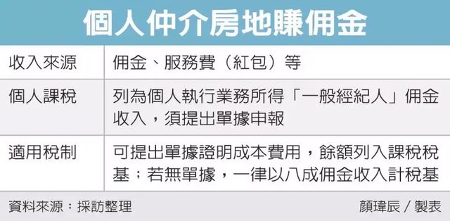 財政部台北國稅局表示,個人提供勞務,居間仲介買賣不動產,得到的佣金收入或酬勞,