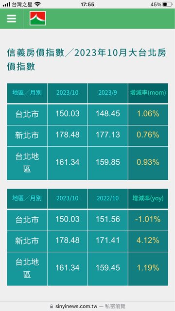 推 Bennyhome: 崩盤了,台北地區年漲1.19%,扣除CPI,房價跌XD 11/16 18:49