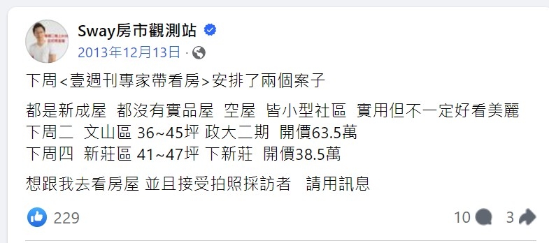 推 vd422: 問卦:有包養SD的卦嗎 11/23 20:35 → D8716770: 十年過去了,他推薦的下新莊房價估計漲了兩成,大概連通 11/23 20:45