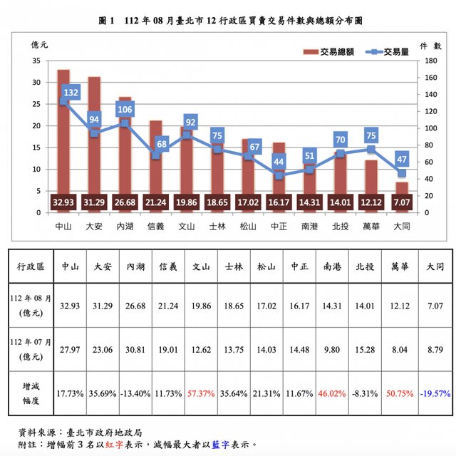 交易總額增幅最大為文山區,較7月增加57.37%;減幅最大為大同區,較7月減少19.57%。