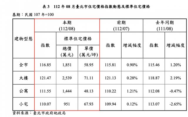 價格部分,大樓住宅價格指數121.47,較7月121.13上升0.28%;公寓住宅價格指數111.55