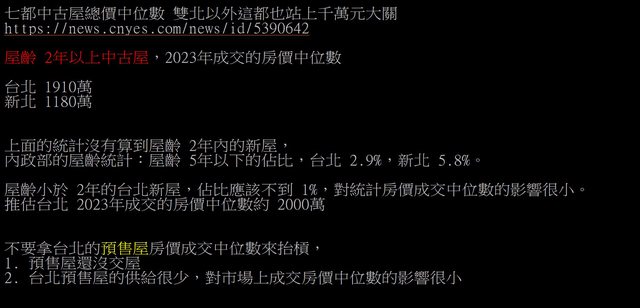 推 CaLawrence: 確實搞錯了 2023年台北房價中位數是1910萬 預售才是29 12/28 20:33