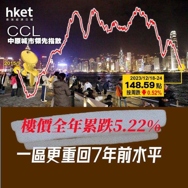 點,重回2017年2月底水平;CCL於2023年全年則累跌5.22%。4區樓價3跌1升,當中港島區