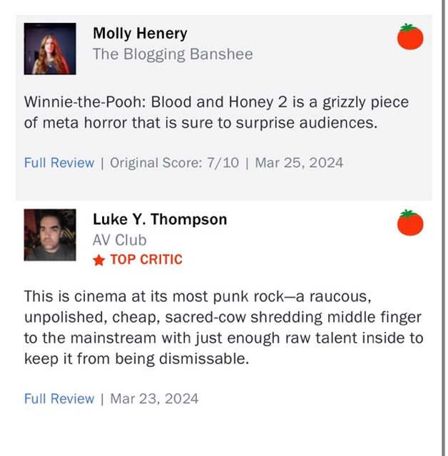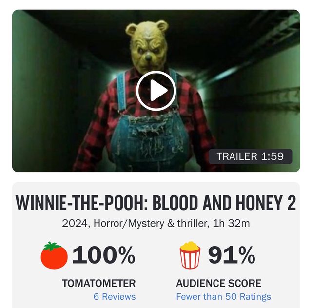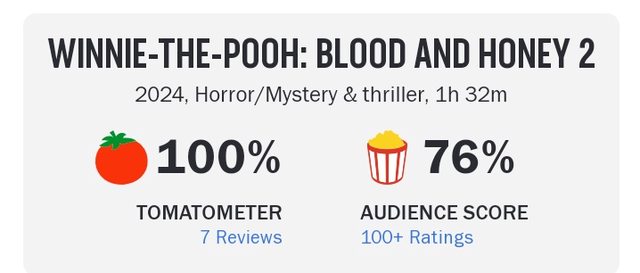 https://www.rottentomatoes.com/m/winnie_the_pooh_blood_and_honey_2小熊維尼:血與蜜2》震撼首映, 爛番茄評分100%滿分。 第一部電影的評分為3%。 https://i.imgur.com/4s2Itqh.jpg