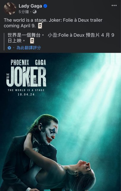 → toebb : 《小丑:雙重瘋狂》10月02日上映(比美國早2天) 04/03 00:40