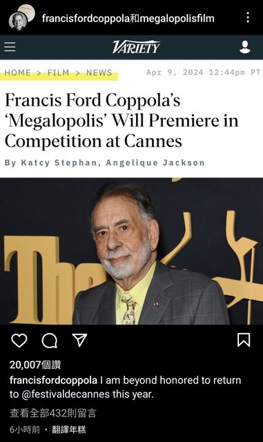 今天稍早《Variety》稱收到內線消息,表示兩屆金棕櫚得主Francis Ford Coppola的最 新作《Megalopolis》將入圍第77屆坎城影展主競賽單元,並於5/17全球首映 本人也在ig上證實(?)了 https://i.imgur.com/ZHyvoFq.jpg