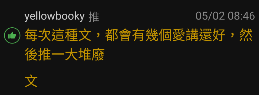 推 yellowbooky : 每次這種文,都會有幾個愛講還好,然後推一大堆廢 05/02 08:46