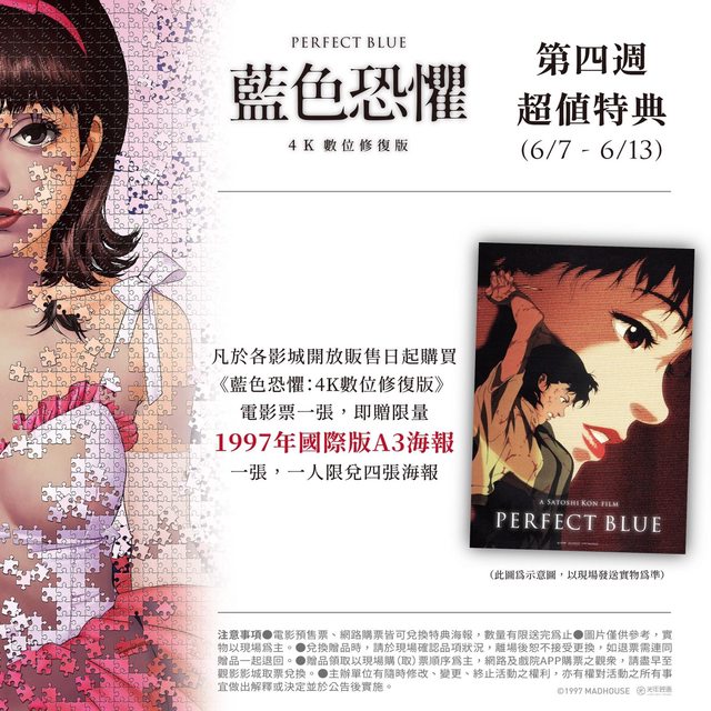 藍色恐懼:4K數位修復版 第四週(6/07-6/13)超值特典公佈 大魔王強片齊聚的一週.... 但老闆還是說服日本可印這張珍貴國際版海報 凡於各影城開放販售日起,購買《藍色恐懼:4K數位修復版》電影票一張,即贈限量「19 97年國際版A3海報」一張,一人限兌四張海報 此特典為「非賣品」,切勿非法偽造轉賣,也勿透過不明管道獲取 https://i.imgur.com/KeCFdNZ.jpeg