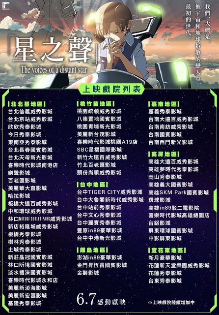 全台上映戲院列表 《星之聲》是「日本動畫大師」新海誠一鳴驚人的個人獨立製作動畫電影、是他的首部商 業動畫電影、也是新海誠邁向百億票房動畫大師的起源作品。 https://youtu.be/koaP44JaK1I?si=Q4EOAy-W9AFLJh2t