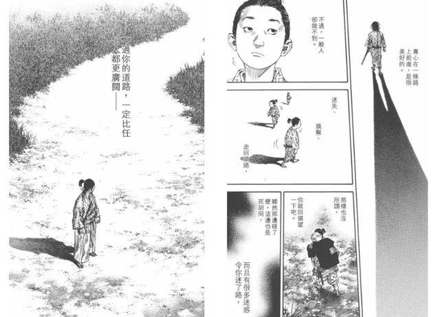 看哥吉拉-1.0時,想到一部作品,井上雄彥畫的漫畫-浪客行。裡面刻劃著兩號人物-大名鼎鼎的宮本武藏,以及他的童年玩伴-本位田又八。所謂近朱者赤,按道理說,兩人應該會有差不多的人生成就,不過如同親身經歷的事實,並非如此。