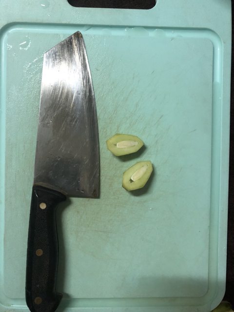 放上砧板後,開始對半切開,看到裡面的籽,一樣把 菜刀 跟 切開後的芒果 放在一起,