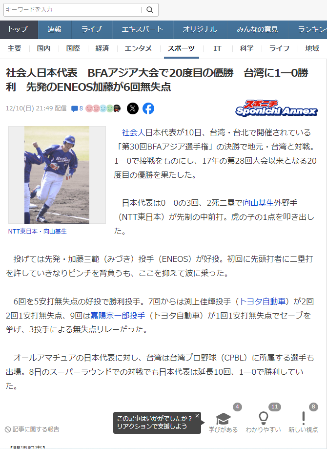 → newsbow: 第一篇說果然日本由社會人出賽的話不太會吸引注意,還提 12/10 22:05