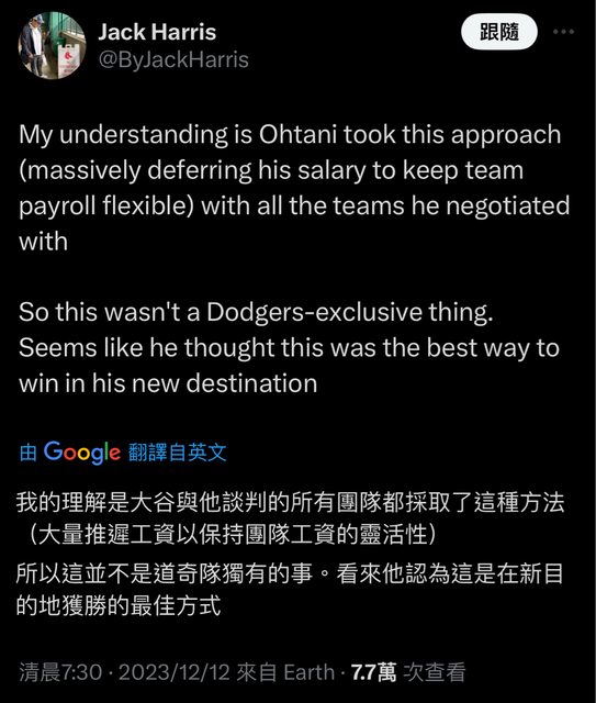 My understanding is Ohtani took this approach (massively deferring his salaryt o keep team payroll flexible) with all the teams he negotiated with So this wasn't a Dodgers-exclusive thing. Seems like he thought this was thebe st way to win in his new destination 這套方案並不是專屬於道奇 大谷有向所有與他談判的球隊提出這個方案 大谷是不是在天使輸到怕了 寧可極端延遲支付也要讓球隊補強 == -- ※ 發信站: 批踢踢實業坊(www.ptt.org.tw), 來自: 180.217.133.242 (臺灣) ※ 文章網址: https://www.ptt.org.tw/Baseball/M.1702340373.A.172