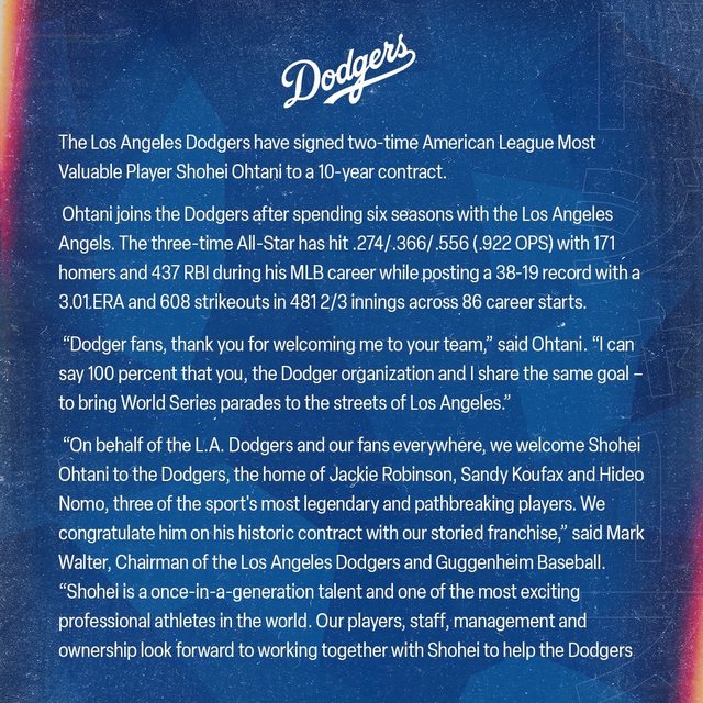 The best in Sho. Welcome to the Los Angeles Dodgers, Shohei Ohtani! ロサンゼルス・ドジャースへようこそ、大谷翔平! 大谷也發表聲明: "Dodger fans, thank you for welcoming me to your team," "I can say 100 percent that you, the Dodger organization and I share the same goal - to bring World Series parades to the streets of Los Angeles." "道奇隊的球迷們,感謝你們歡迎我加入你們的球隊, 我可以百分之百的肯定,你們、道奇球團和我有共同的目標-把世界大賽的遊行帶到洛杉 磯的街頭。" https://i.imgur.com/WDMPmLi.jpg