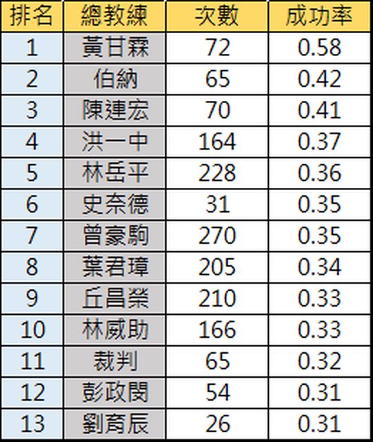 富邦一口氣從去年墊底,爬到今年第一! 最後附上「按教練」的挑戰成功率排名 *表上的裁判是指主審面對有疑問的判決時 自行決定使用重播輔助判決 https://i.imgur.com/BxYRdY0.png